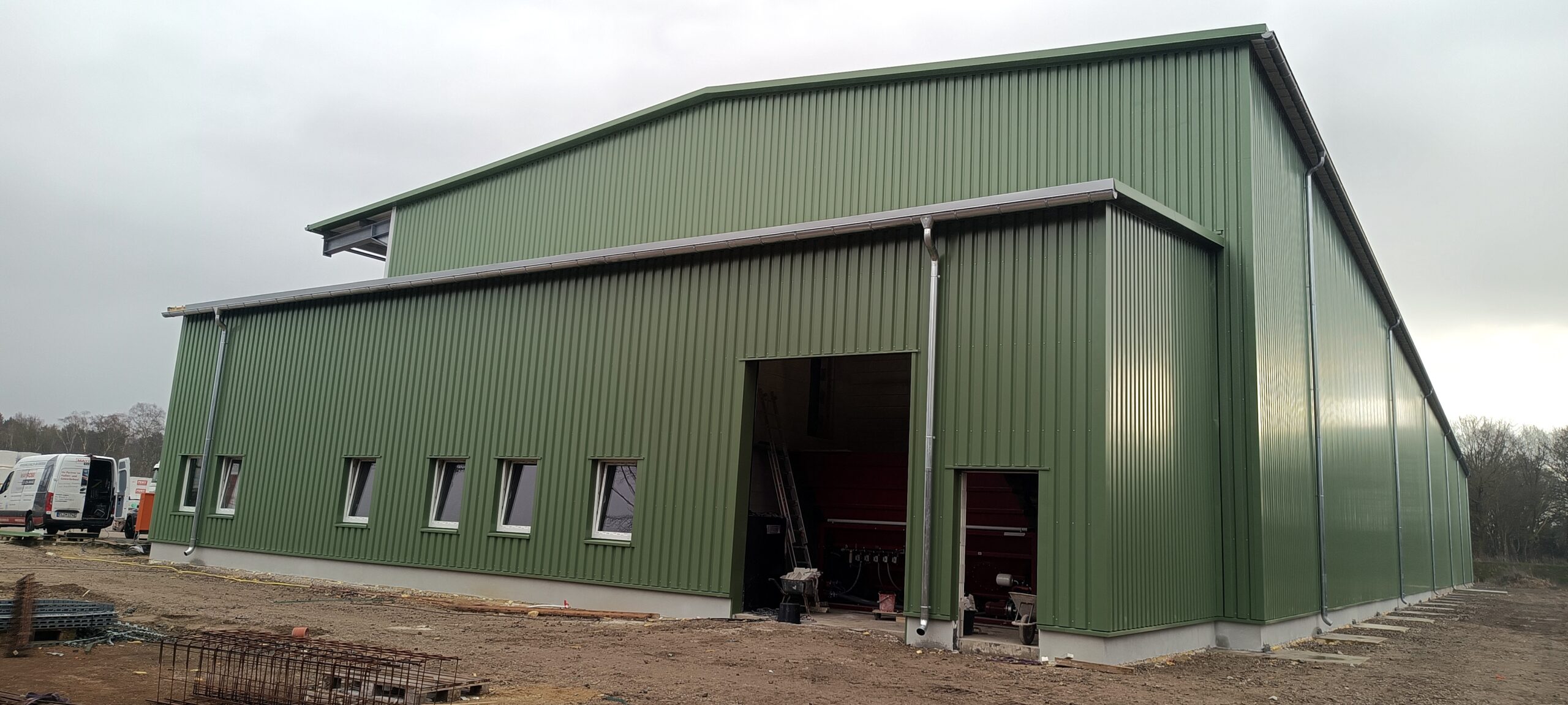 Die Arbeiten für die neue Halle der Emsländer Baustoffwerke schreiten voran. Es entsteht eine Halle mit einem umbauten Raum von ca. 21.500 cbm. Die Pflasterfläche von 7000 qm ist bereits fertiggestellt.